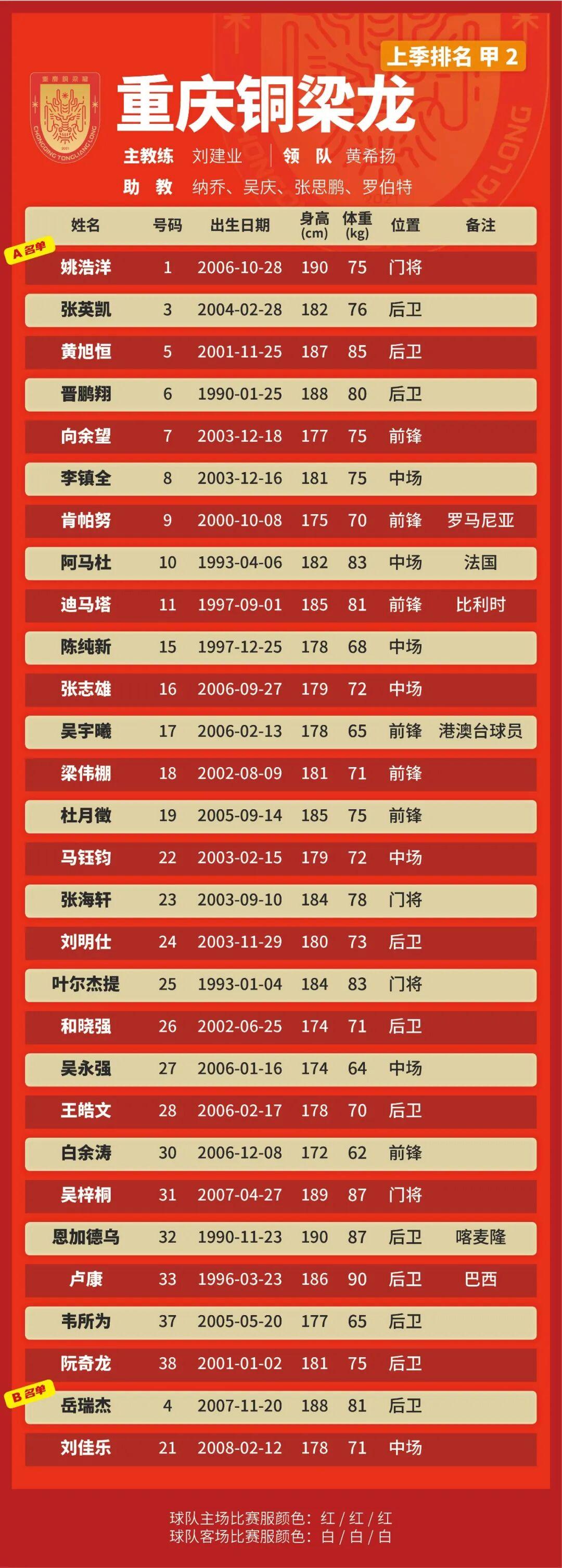 p.s.数据采用各队中超报名表登记内容,